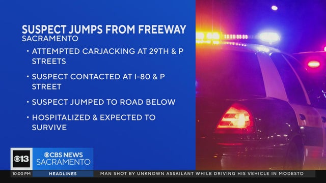 A suspect in an attempted carjacking suffered minor injuries after he jumped from a Sacramento freeway to a road below while trying to flee authorities.