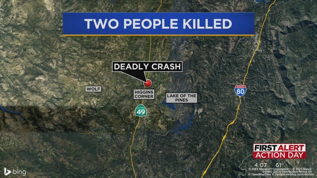 Authorities say two people, including an adult and a child, were killed in a single-car crash on Highway 49 early Tuesday afternoon.
