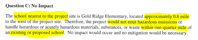 "the project would not emit hazardous emissions or handle hazardous... material, substances or waste within one quarter mile of a school" claiming that "the school nearest to the project site is Gold Ridge Elementary, located approximately 0.6 mile to the west."