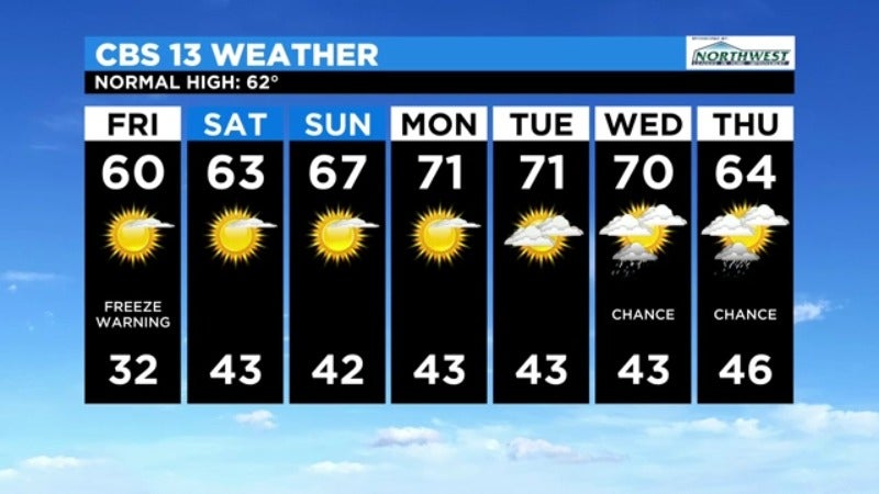 Temperatures will come up as we head into the weekend, with sunny and breezy conditions continuing. On Saturday, we'll see high temperatures in the low 60s, and the upper-60s on Sunday. Our best chances of rain arrive Wednesday.