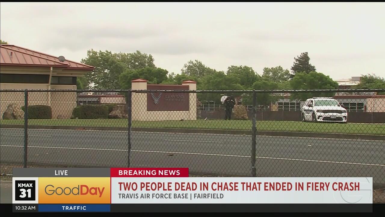 Two people died after a chase ended in a fiery crash at the main gate of Travis Air Force Base, officials say.