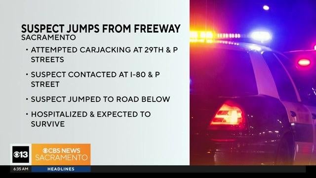The area near I-80 and P Street is cleared after an attempted carjacking last night. CHP says when they arrived on the scene, a suspect walked onto the freeway, climbed over the railing, and jumped to the road below. The suspect was detained and transported to a hospital with non-life-threatening injuries.