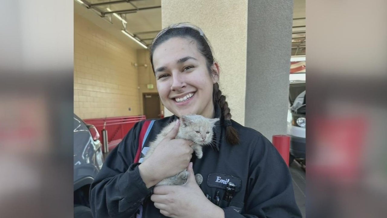 A five-week-old cat was stuck in a car engine and made it all over Stanislaus County and even into San Joaquin County.