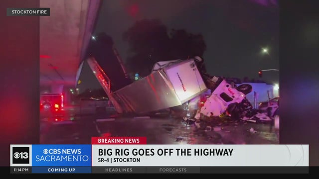 A Stockton road was closed Friday night and a big rig driver was sent to the hospital after crashing down an embankment, the CHP said.