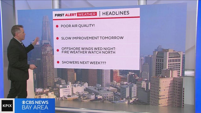 Expect continued poor air quality in the Bay Area Tuesday night, as smoke from Northern California wildfires drifts into the region. Air quality should improve on Wednesday, but offshore winds will prompt a Fire Weather Watch for parts of the North Bay. Paul Heggen has the forecast. (9/19/23)