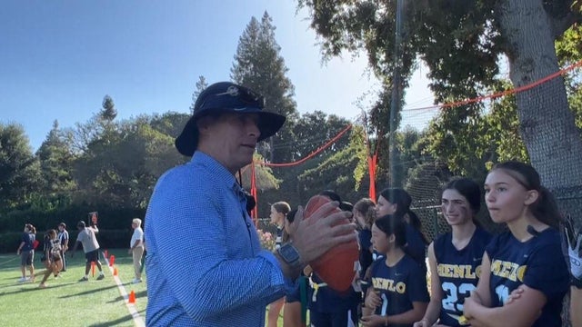 Hall of Fame quarterback Steve Young is an assistant coach for the new Menlo School girls flag football team. Young is helping out his longtime friend - and former 49ers teammate - John Paye. (9-13-23)