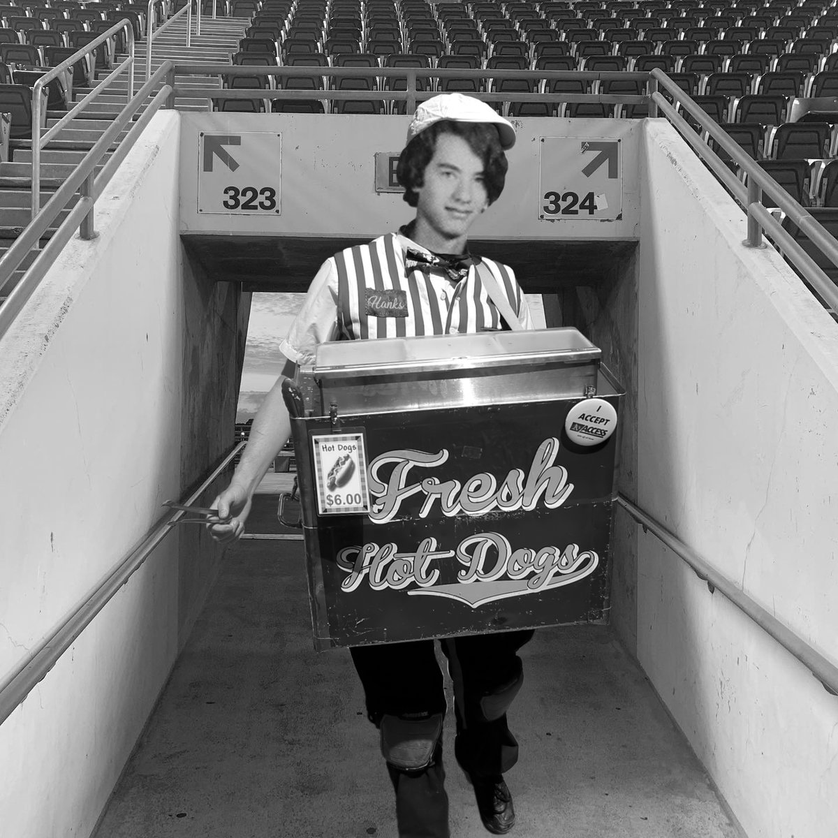 A cutout of Tom Hanks dressed in the concessionaire's outfit he wore decades ago when he hawked $6 hot dogs in the coliseum stands will be among the sea of virtual fans images.