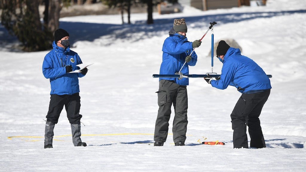 De Guzman spoke from a location near Lake Tahoe where the state periodically measures snow pack. Snow totals there were slightly higher than average, indicating the varying conditions across the state. It's one of hundreds of locations where the state manually and electronically measures snow totals and water content.