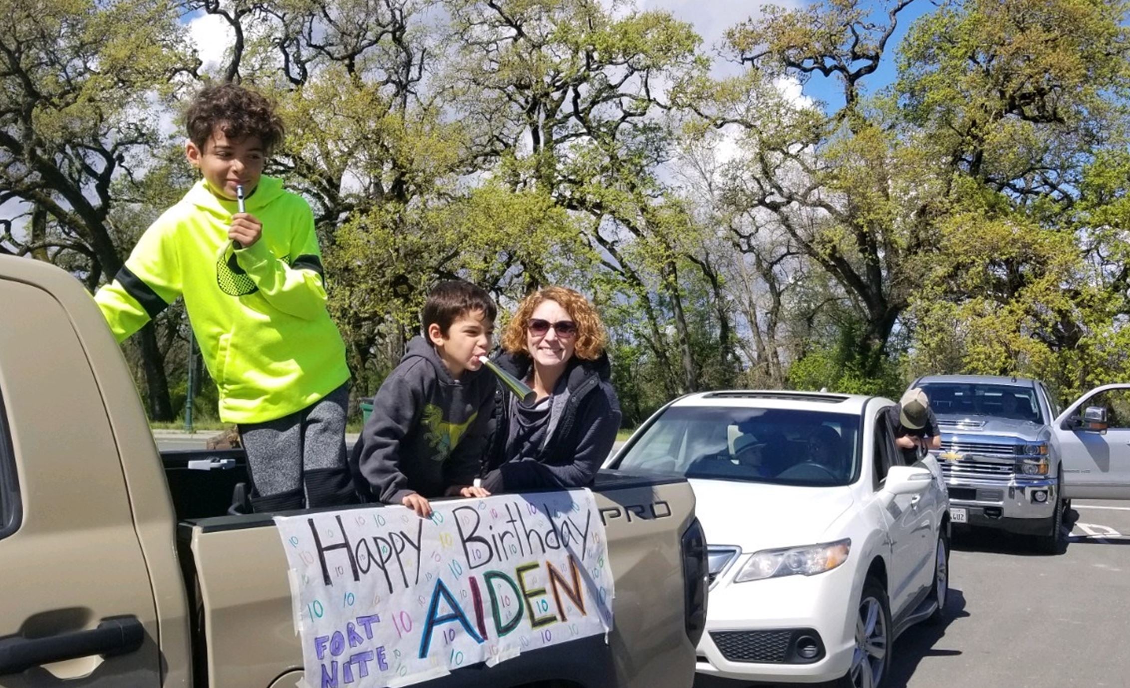 But Aiden family had a big surprise planned for him Wednesday. Around lunchtime, a parade of vehicles appeared outside his house, honking their horns and blasting music to give him a birthday party on wheels.