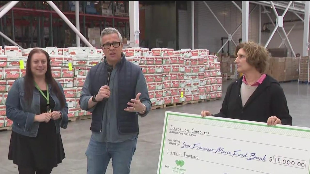 KPIX 5's Reed Cowan talks to Jennifer Roy of Dandelion Chocolates and Katy Mann McKnight of the SF-Marin County, after the chocolatier presented a check as part of Food for Bay Area Families. (12/15/22)
