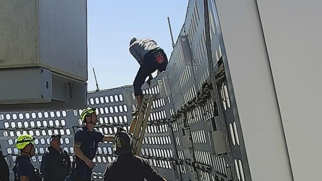 A man who brazenly free-climbed San Francisco's soaring 60-story Salesforce Tower Tuesday was greeted upon his rooftop arrival by firefighters and police who took him into custody. Justin Andrews reports.