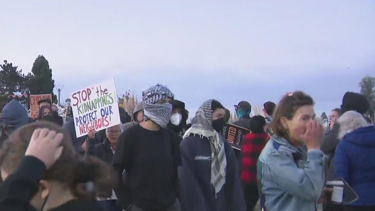 Protesters gathered near Coast Guard Island in Oakland early Thursday ahead of the anticipated arrival of Customs and Border Protection agents, as President Trump's nationwide crackdown on illegal immigration may soon expand to the Bay Area. Veronica Macias reports.