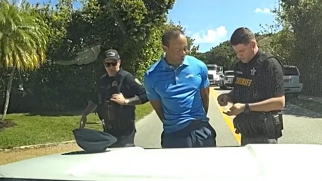 Newly-released body camera video shows golf legend Tiger Woods in handcuffs after a car crash in Florida near his home. In the video, Woods is heard saying, "I was just talking to the president," and performs a field sobriety test while leaning against a police patrol car.