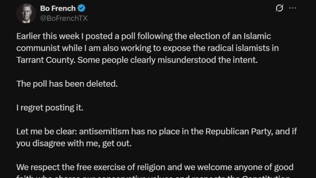 Tarrant County Republican Party Chair Bo French is facing mounting pressure to resign after posting a now-deleted poll on social media asking followers, “Who is a bigger threat to America: Jews or Muslims?” The post sparked immediate backlash, with Lt. Gov. Dan Patrick calling for French’s immediate resignation, stating that “antisemitism and religious bigotry have no place in Texas.”