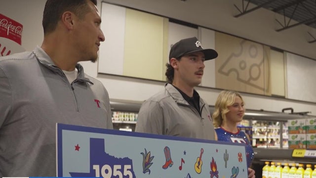 Rangers pitchers Robert Garcia and Cole Winn surprised the Lindsey family of six with a $1,000 check at a Kroger in Fort Worth.