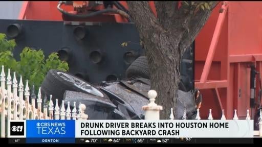 Police say a drunk driver crashed a car through a backyard and then broke into a home. The driver was caught flying off the road and through a construction business before slamming into a tree in that backyard.