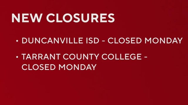 Duncanville ISD and Tarrant County College have announced closures for Monday as the winter storm brings sleet and icy conditions to North Texas.