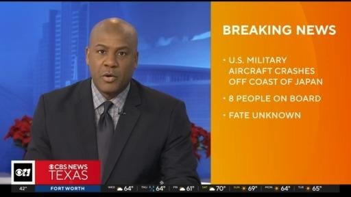 A U.S. Military aircraft has crashed just off the coast of southern Japan. Officials say eight people were on board the V-22 Osprey when it went down. The Japanese Coast Guard has located the debris field and at least one person has been found. No word on that person's condition or the fate of the others on board.