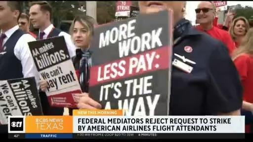 Federal mediators have rejected a union request that could have cleared the way for a year-end strike by flight attendants at American Airlines. The National Mediation Board instead directed the airline and the Association of Professional Flight Attendants to keep negotiating over a new contract.