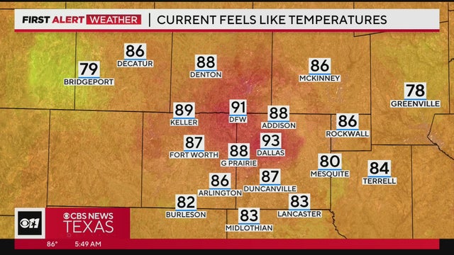 Today: Mostly sunny, hot and humid. Isolated afternoon storms (east of DFW) High: Mid 90s. Heat index: 102-104. Wind: South 5 mph.