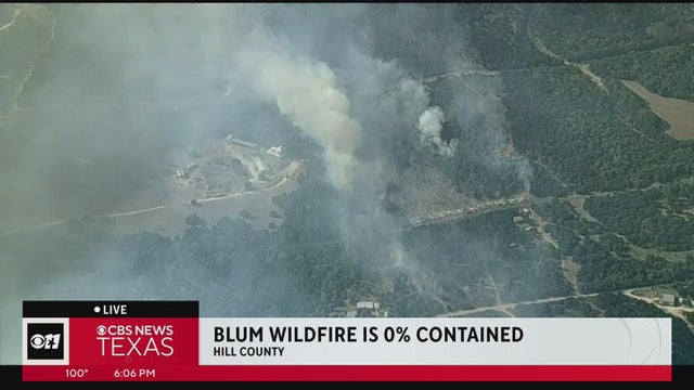 The Texas A&M Forest Service said the fire in Blum is 0% contained and "aircraft and ground resources are engaged in structure protection." TFS also said the fire is exhibiting "active behavior with long-range spotting."
