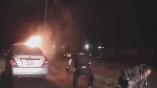 Body camera video shows two officers running towards the burning car.