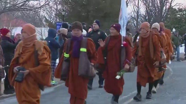 A group of Buddhist monks reached Washington, D.C., on foot Tuesday, walking single file across a bridge over the Potomac River to cap a 15-week trek from North Texas that has captivated the country.