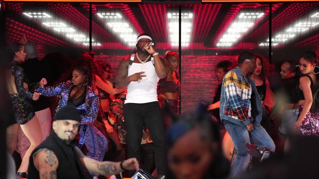 50 Cent, not among the announced performers, started his "In Da Club" while hanging upside inside one of the rooms.