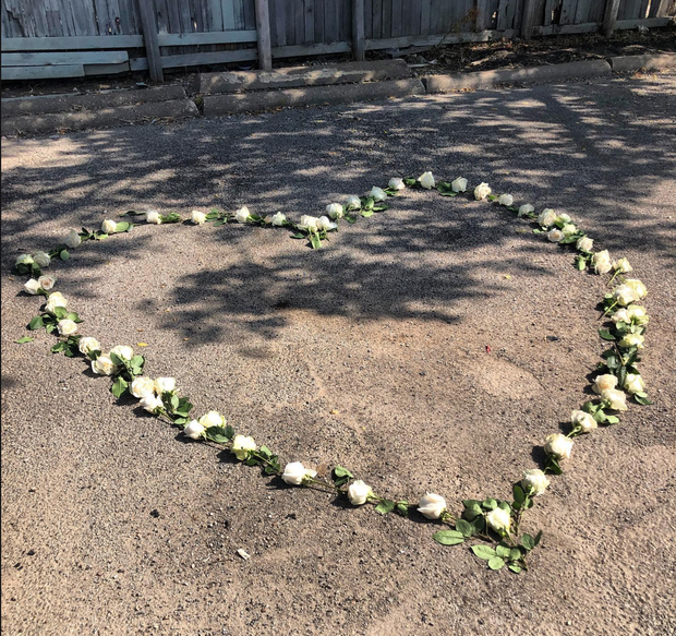 A heart-shaped ring of roses was placed at the site of the grisly murder scene.
