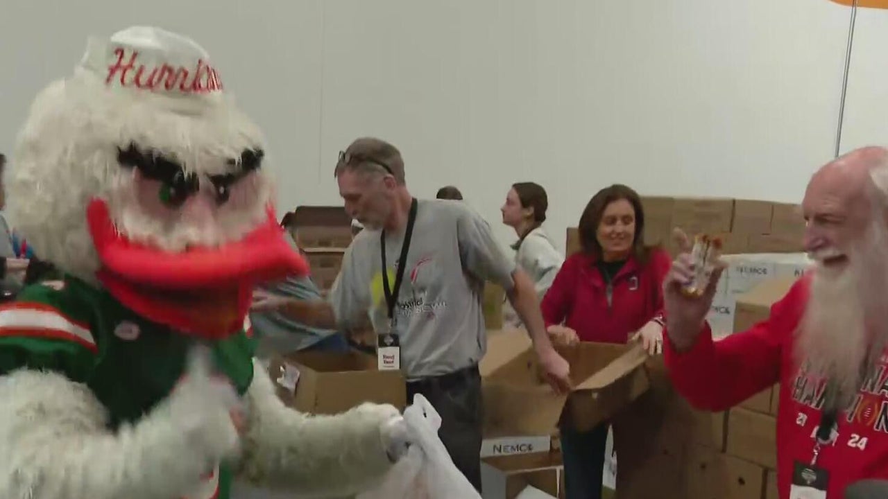 Ohio State University and University of Miami students and players put their rivalry aside and teamed up for a community service event with the North Texas Food Bank.