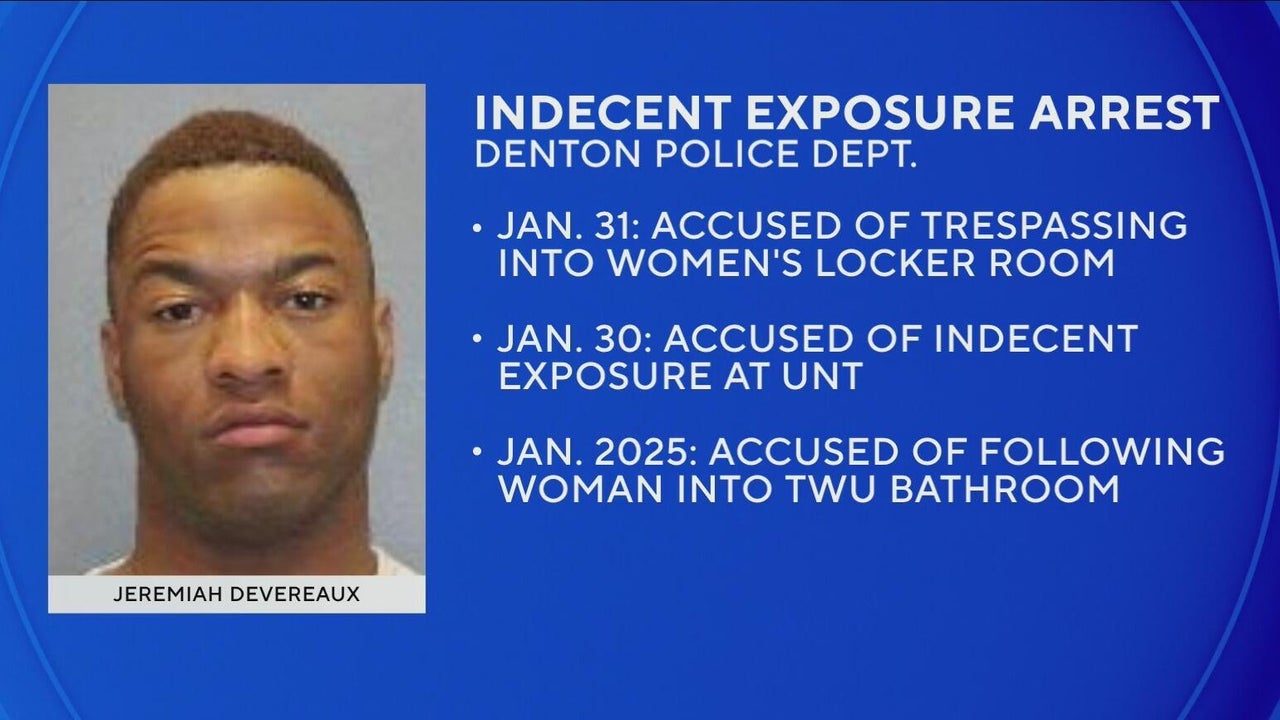 Denton police say they’ve arrested Jeremiah Devereaux in connection with a series of incidents involving women’s restrooms and locker rooms. Detectives have linked him to at least three cases, including entering a women’s locker room at a gym on Jan. 31 and exposing himself to a woman in a bathroom on the UNT campus the day before. Police also noted he was arrested last year after allegedly following a woman into a bathroom stall at TWU. Investigators believe Devereaux may be involved in additional incidents and are continuing to review reports.