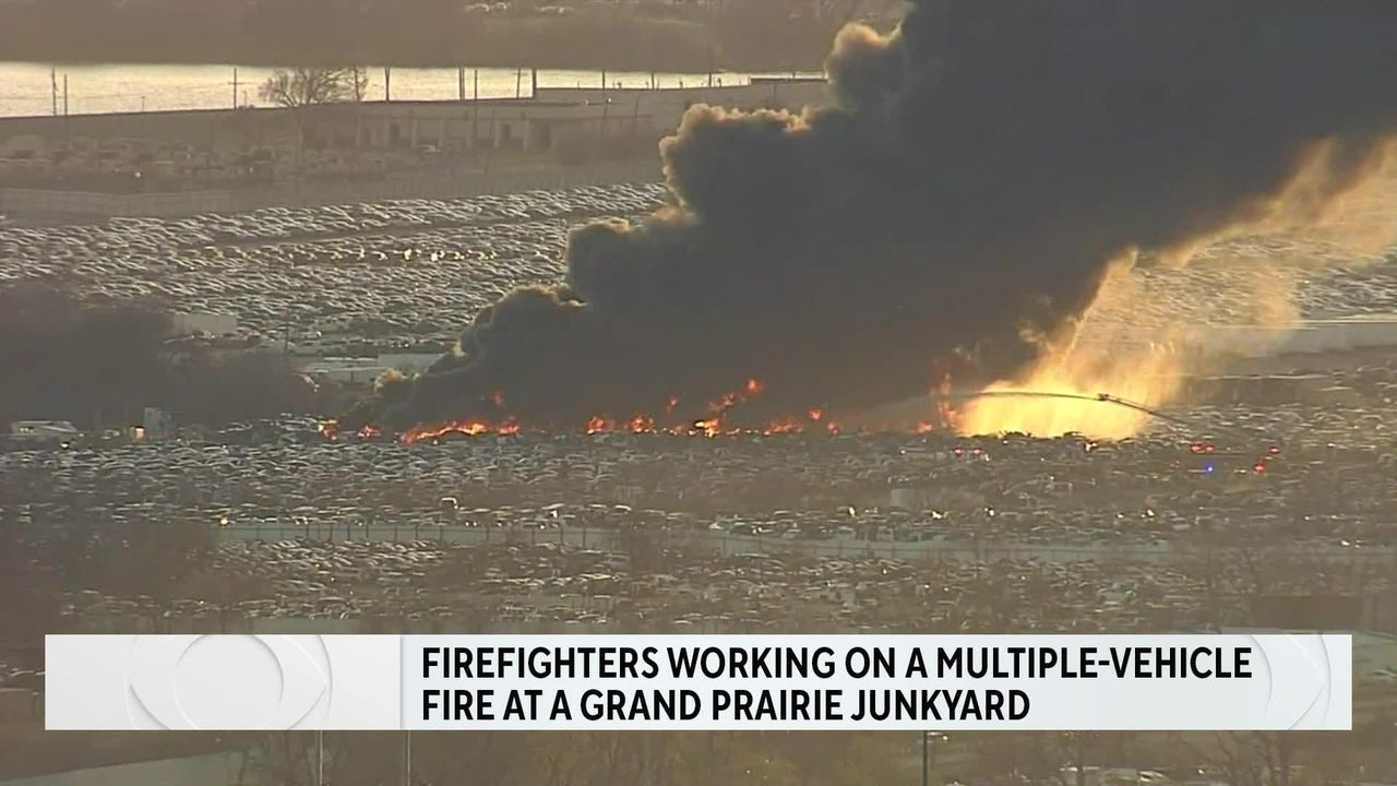 Firefighters battling a blaze at a multiple-vehicle fire at a Grand Prairie junkyard on East Jefferson Street. Stay with CBS News Texas for more details.