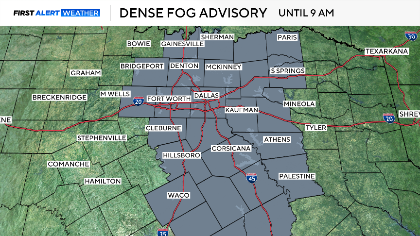 A dense fog advisory is in effect for most of North Texas until 9 a.m. Tuesday.