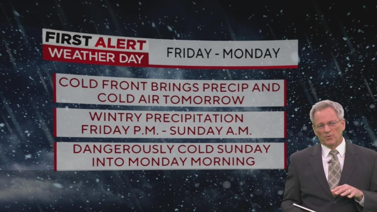 First Alert Weather Days are in effect for Friday through Monday due to the approaching winter storm. The National Weather Service has issued a winter storm warning for the entire region from 6 p.m. Friday through noon on Sunday.