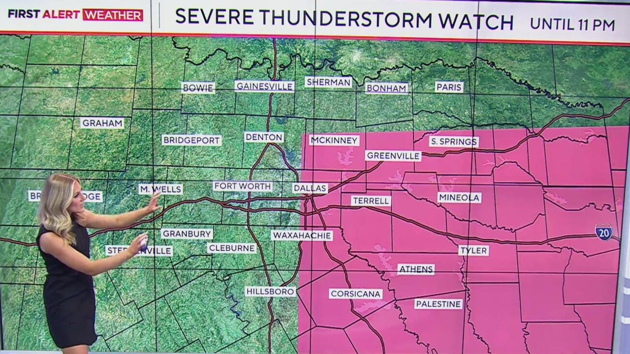 A severe thunderstorm watch has been issued for North and Central Texas locations along and east of I-35/I-35E and east of Hwy. 75 near the Red River until 11 p.m. The warning includes Dallas, Ellis, Rockwall, Kaufman, Van Zandt and Collin counties.