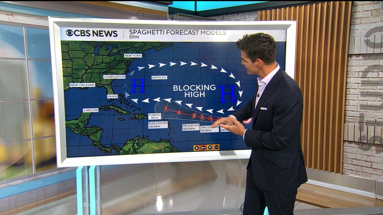 Tropical Storm Erin, which formed on Monday, could strengthen and become the first Atlantic hurricane of 2025. CBS News meteorologist Rob Marciano reports on the latest developments.