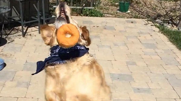 This Golden Retriever's mouth-eye coordination skills are on the fritz (that's also his name). His owner is trying to teach him to catch, one snack at a time.