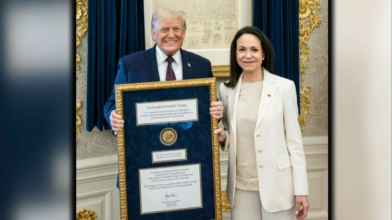 Venezuelan opposition leader María Corina Machado presents Trump with her Nobel Peace Prize